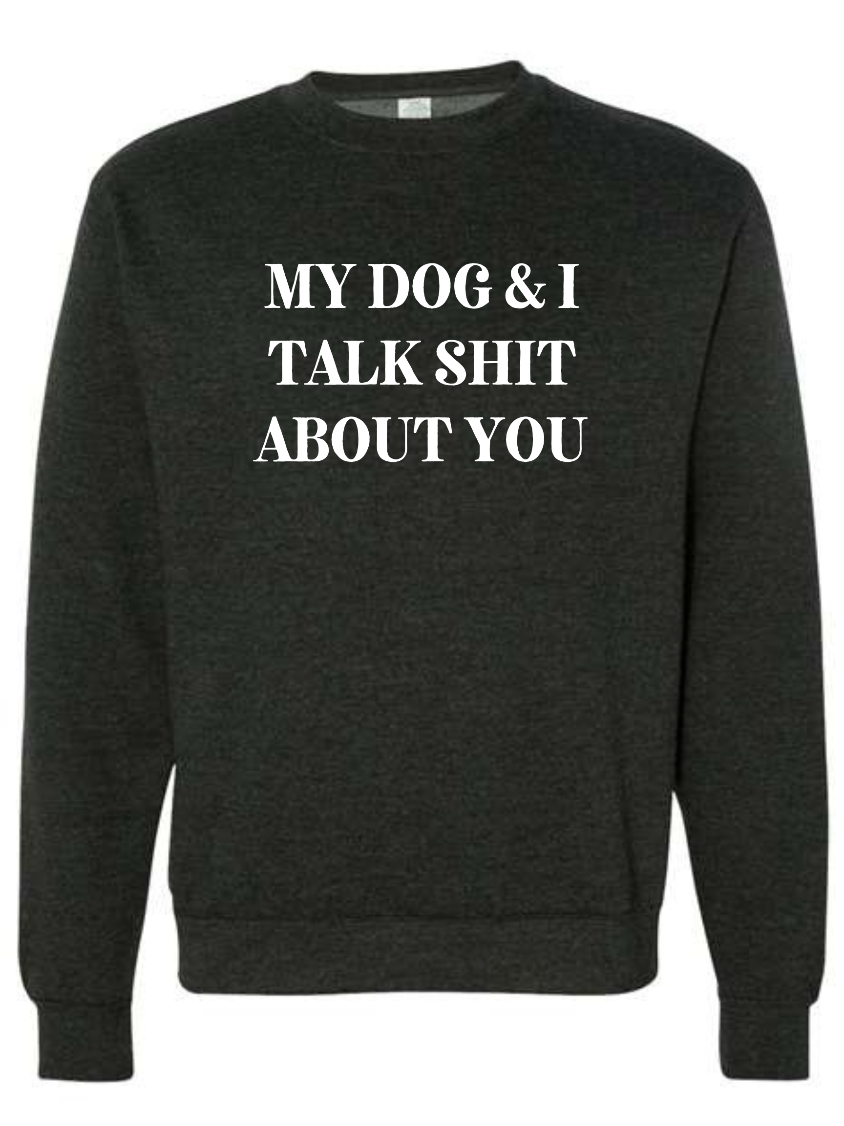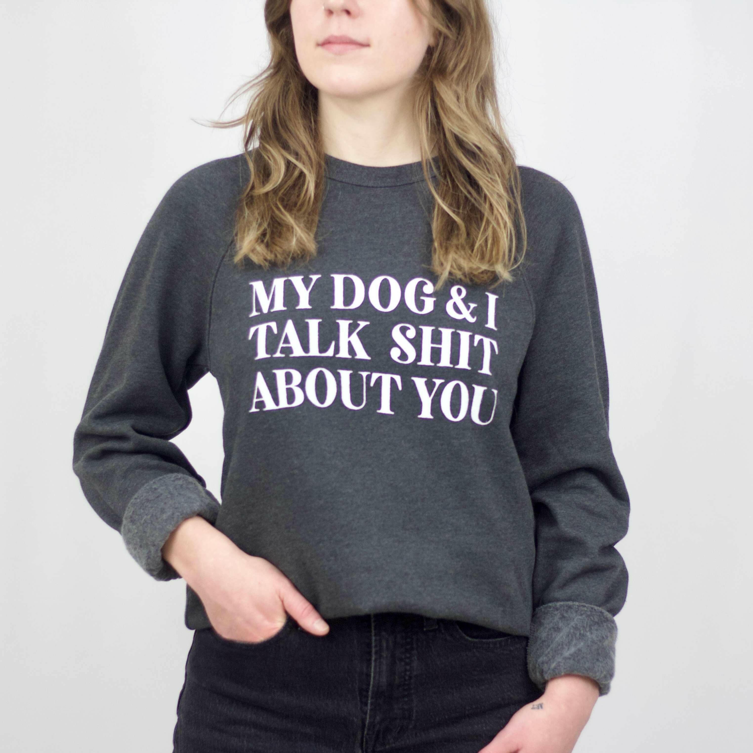 Join in on the fun with our "My Dog & I Talk Shit About You" sweatshirt. Made with soft fabric and featuring a humorous design, this sweatshirt will keep you cozy while making a statement. Perfect for dog lovers and anyone who loves a good laugh. (No actual shit-talking involved!)