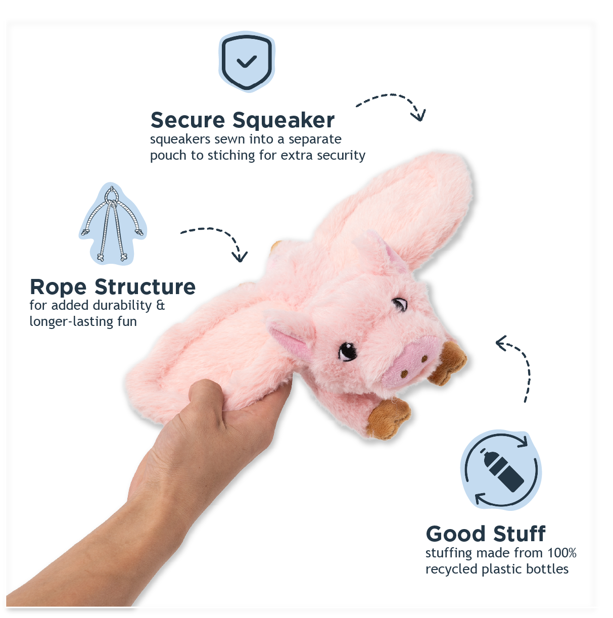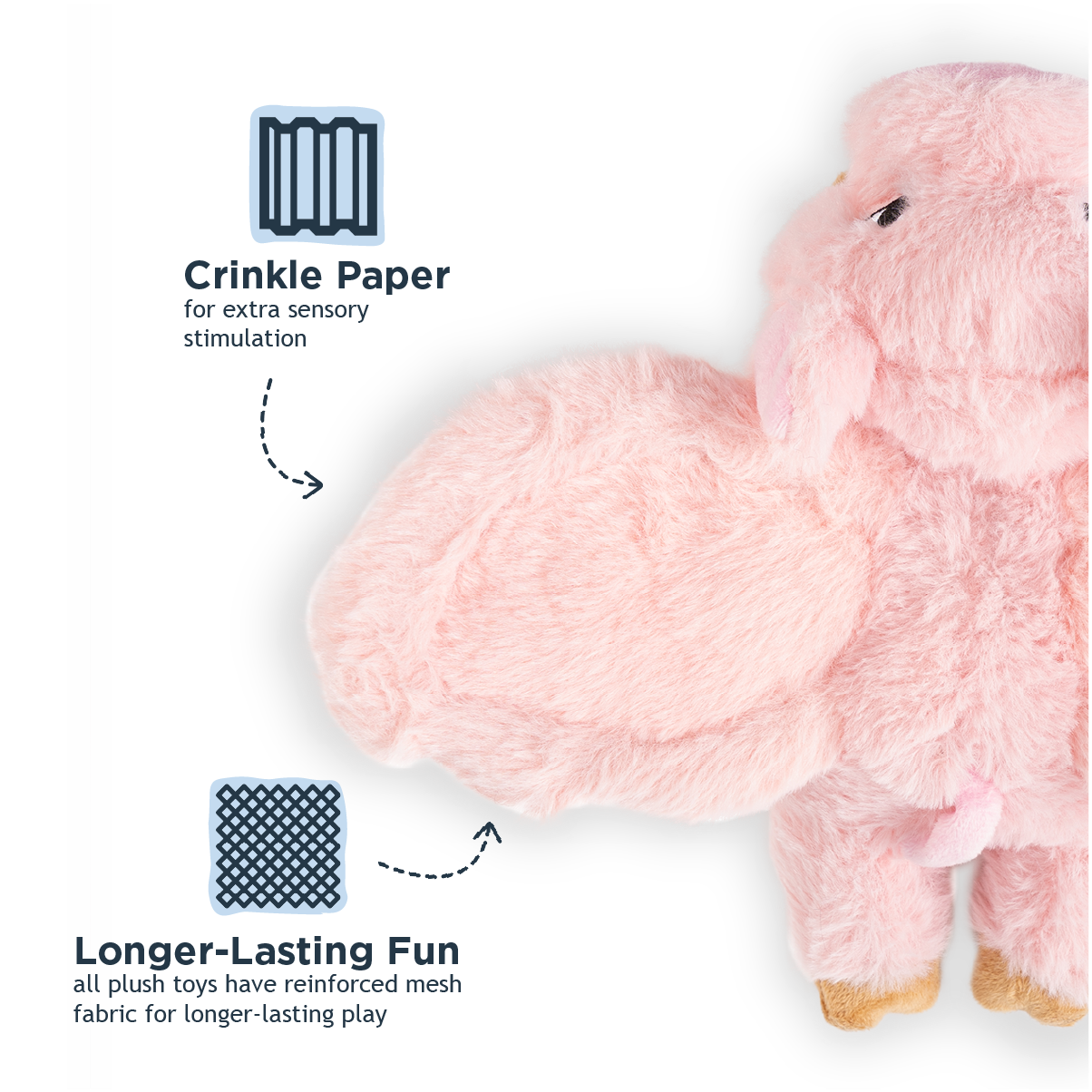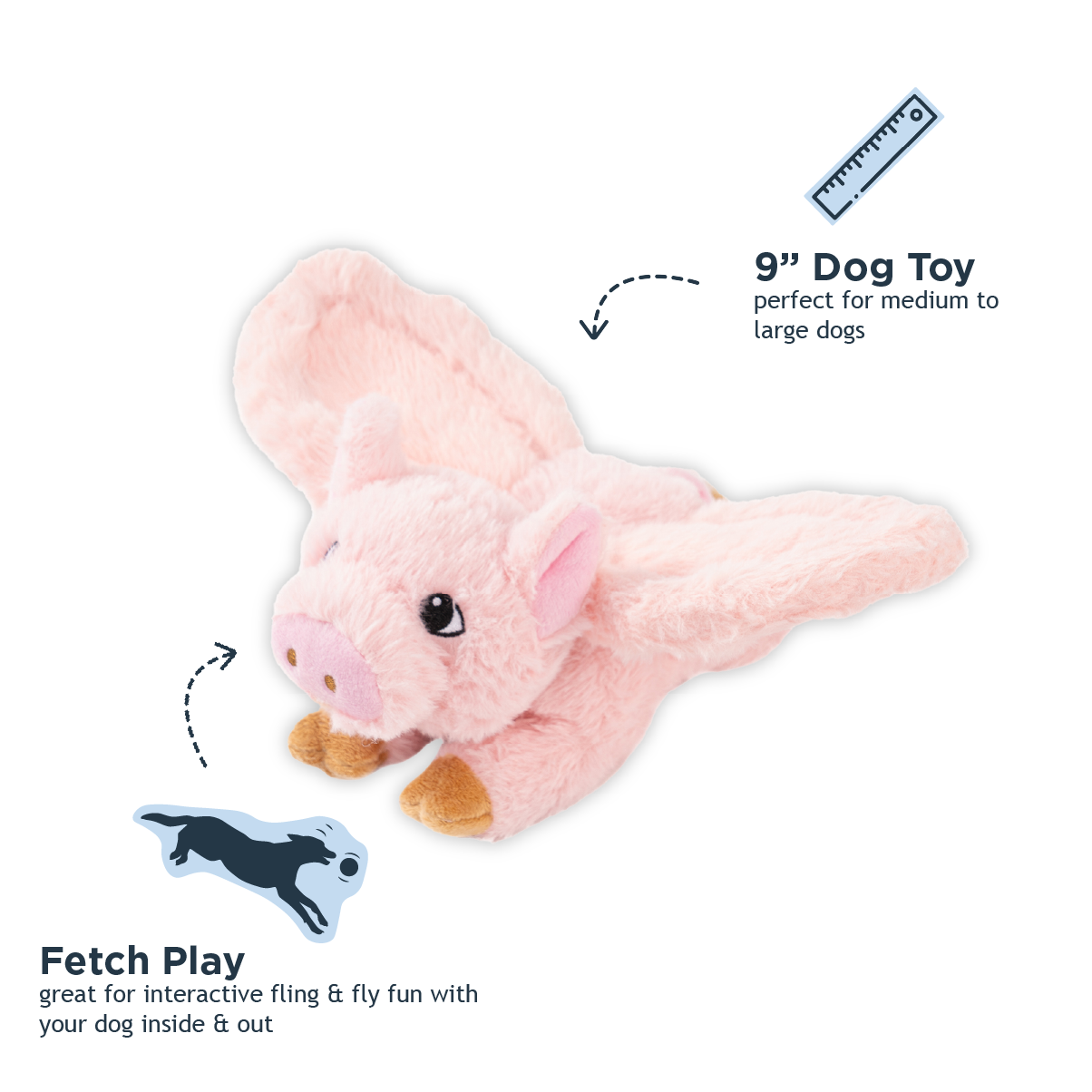 This adorable 12-inch plush pig is ready for action-packed playtime! The built-in rope core keeps it soaring through the air for impressive throws, while durable mesh construction stands up to enthusiastic fetching sessions. A hidden squeaker tucked safely into its own pouch adds extra excitement to every catch. Spot clean for easy maintenance and lasting fun.