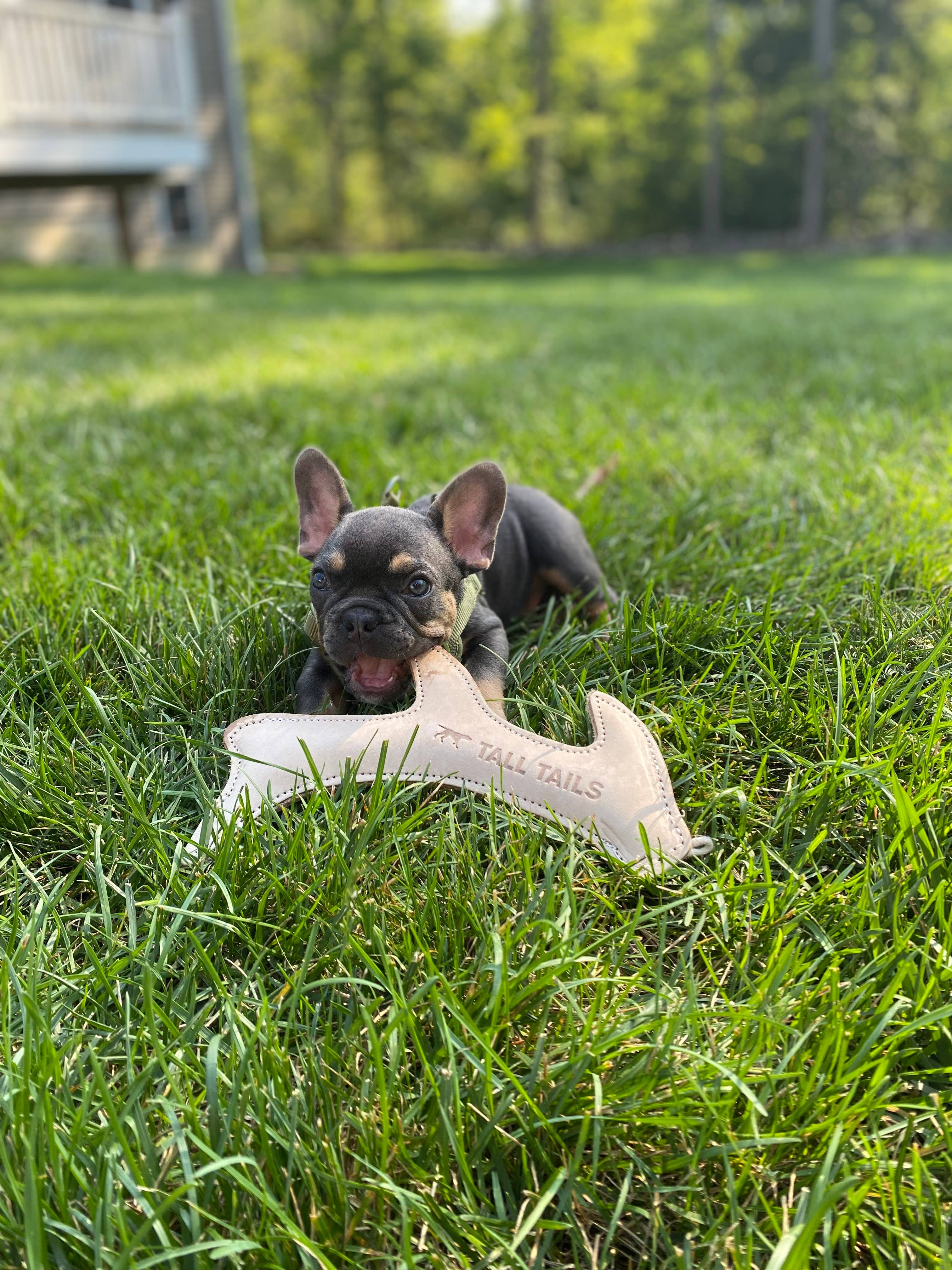 Natural Leather Antler Dog Toy • 11" leather dog toy • Sturdy buffalo hide • Natural coconut husk fiber fill • Sturdy stitching for long-lasting play • Perfect for a game of fetch, tug-of-war, and other interactive play fun • Ideal for medium and large dogs, who love to retrieve and tug • NOT a chew toy — please supervise during playtime and remove if toy becomes a choking hazard • Spot clean recommended