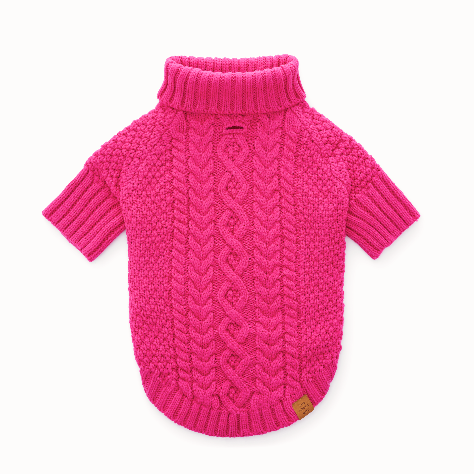 A soft and cozy cable knit sweater with an adjustable turtleneck and leash access hole.
