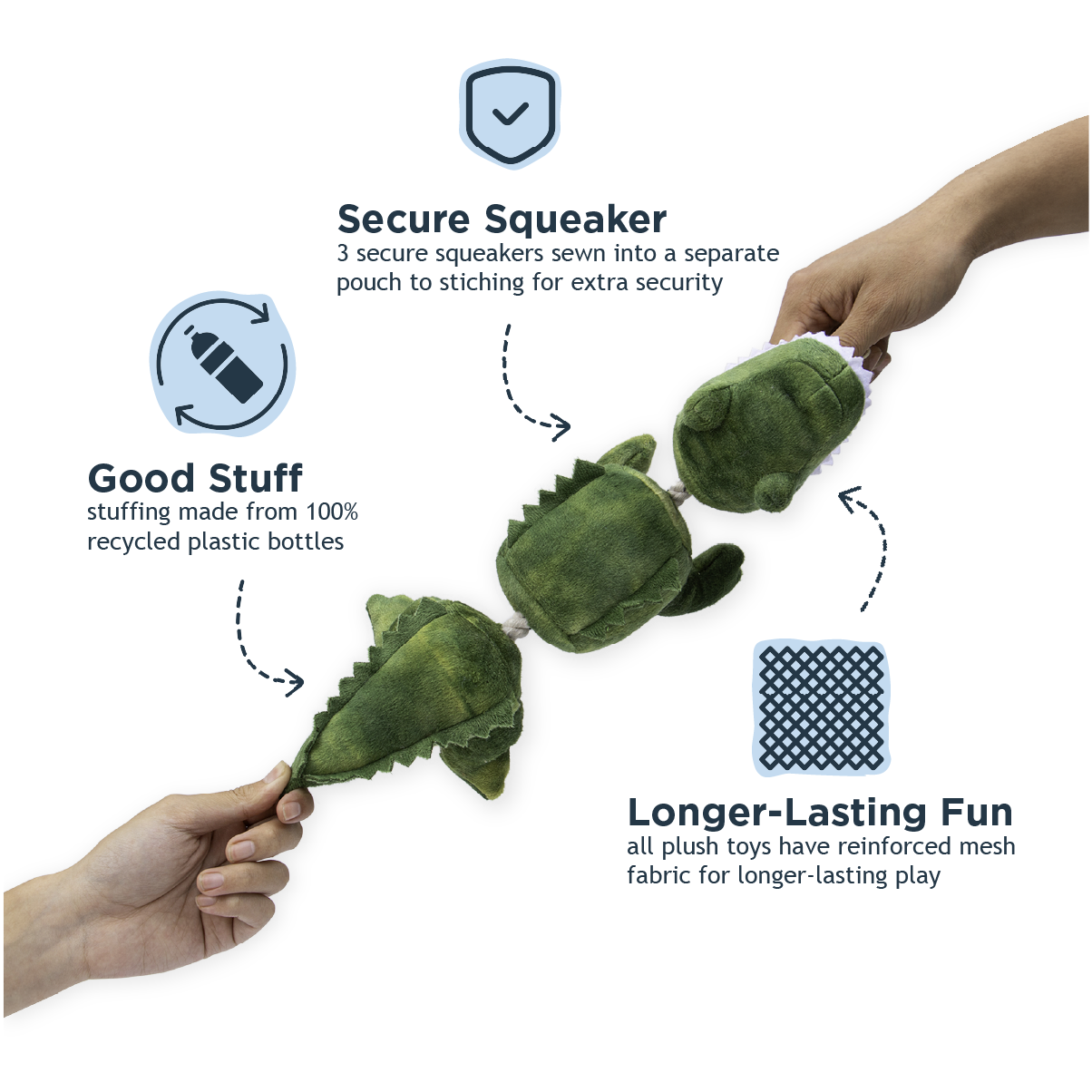 Watch your pup go wild with this 14-inch Gator Jointed Shake toy! Its flexible, segmented design begs to be thrashed around, while the reinforced mesh fabric stands up to serious shaking sessions. The squeaker is tucked safely into its own pouch and double-stitched for durability—because we know your dog means business. Perfect for dogs with serious prey drive who live for that satisfying shake-shake-shake action. Spot clean when needed.