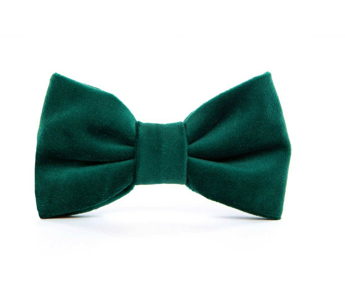 Our most luxe bow tie features the softest, most sumptuous plush green velvet. Removable bow tie gives an extra dose of dapper when you need it -Slides onto most standard-width collars with elastic loops on the back -Two loops for added stability (no more bow tie droop!) SIZING Choose between two sizes: -Small (4" W x 2.5" H): for smaller dogs or dogs looking for that classically preppy bow tie look -Large (5" W x 3.5" H): for bigger dogs, dogs with long fur, or small dogs looking to make a statement CARE -Hand wash or machine wash in cold water. Air dry flat.