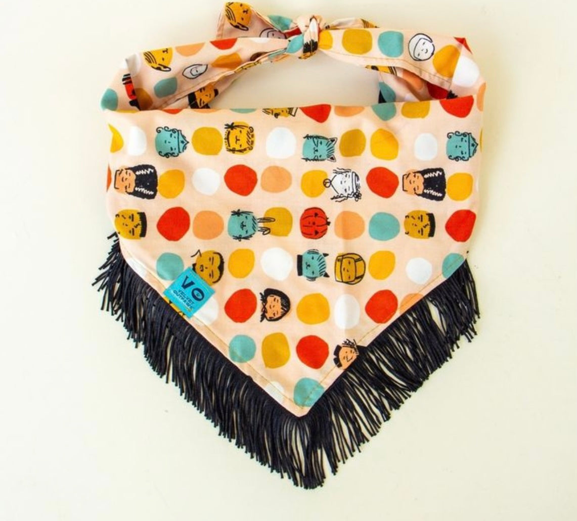 Details - Unique triangle-tie shape makes this bandana easy to tie on (no folding needed) -100% lightweight cotton. Fringe is 2 inches long. Handmade in Louisville, Kentucky by Velvet Outpaws.